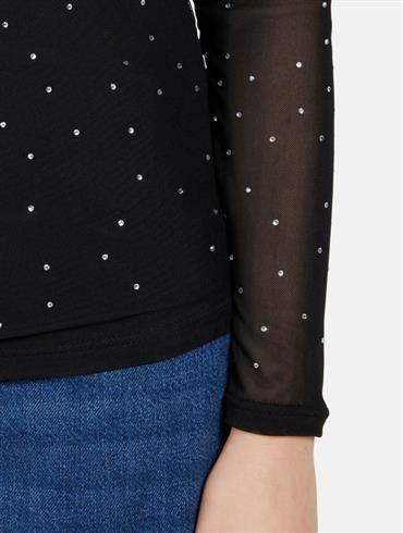 Flot og rå mesh bluse fra B. Copenhagen med påsat simili sten. Blusen er i en tæt siddene model, med turtelneck og lange ærmer