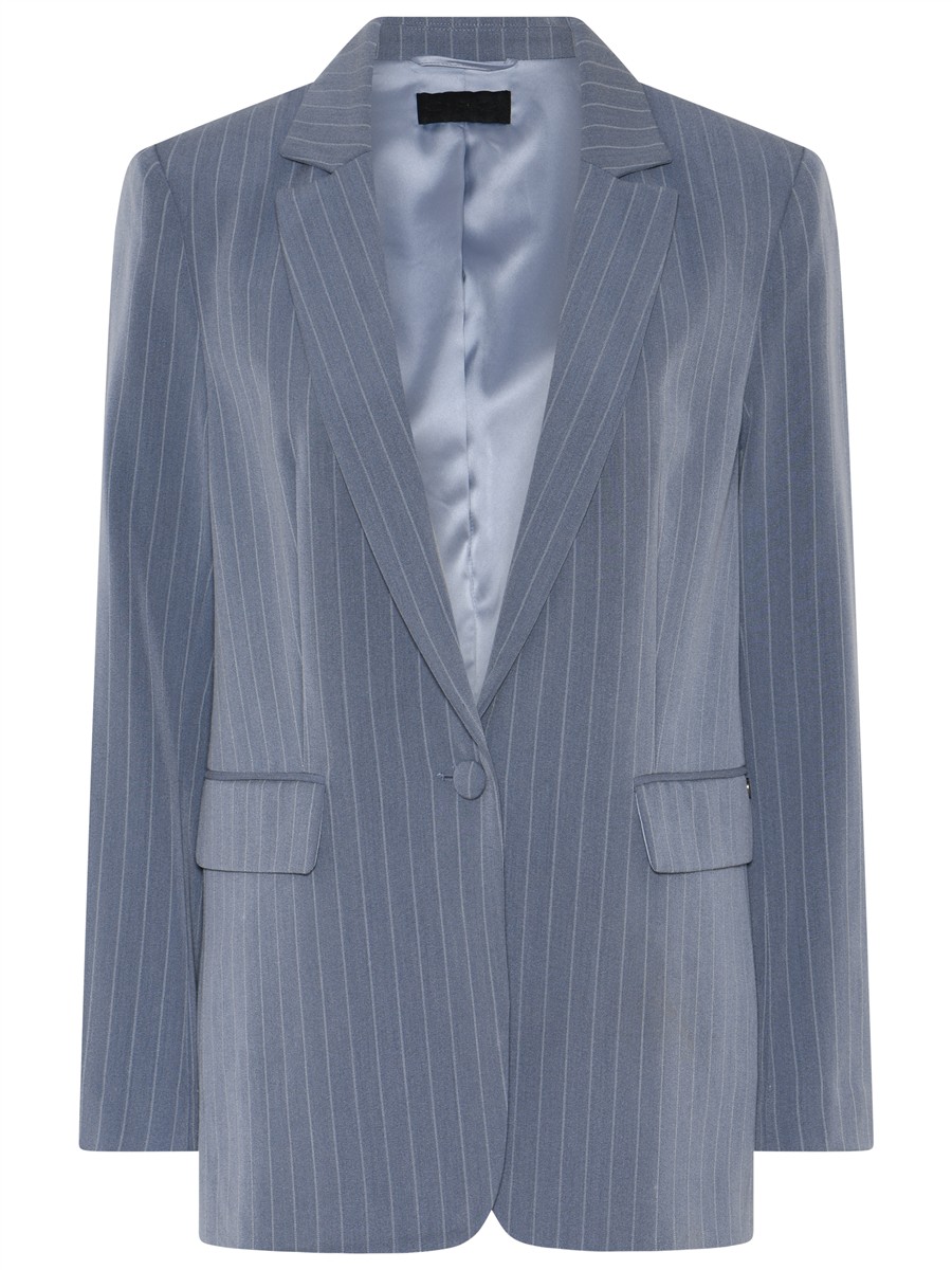 Den lyseblå nuance kombineret med fine, vertikale pinstripes giver et let og sofistikeret look, der både kan bruges i hverdagen og til mere formelle anledninger. Blazeren har en klassisk, enkel lukning med én knap, som fremhæver taljen og giver en smuk, slank silhuet. Foran har den to diskrete klaplommer, og indvendigt er den foret med et glat, skinnende for, der sikrer en behagelig pasform gennem hele dagen. Bagsiden er lige så veludført med et rent, struktureret snit og tre knapper på hvert ærme, som understreger den høje kvalitet og det gennemførte design.