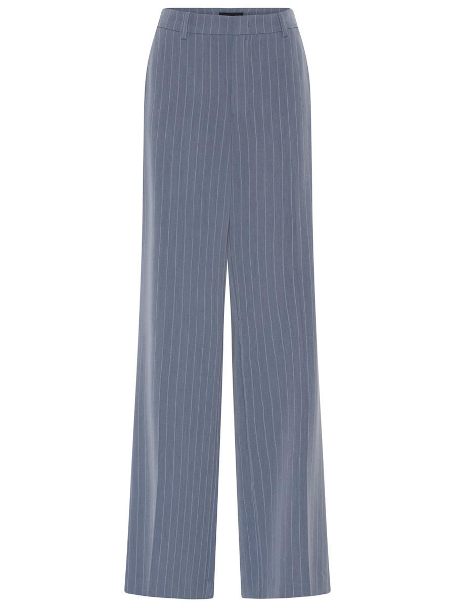 Ceros nålestribede wide leg bukser har et klassisk og elegant udtryk med deres høje talje, lige ben og fine hvide nålestriber på en smuk blå bund. Pasformen er afslappet, men stadig sofistikeret, og den skjulte lukning foran giver et rent og velklædt look. Bagpå fuldendes stilen med to diskrete paspolerede lommer, som understreger buksernes tidløse pasform.
