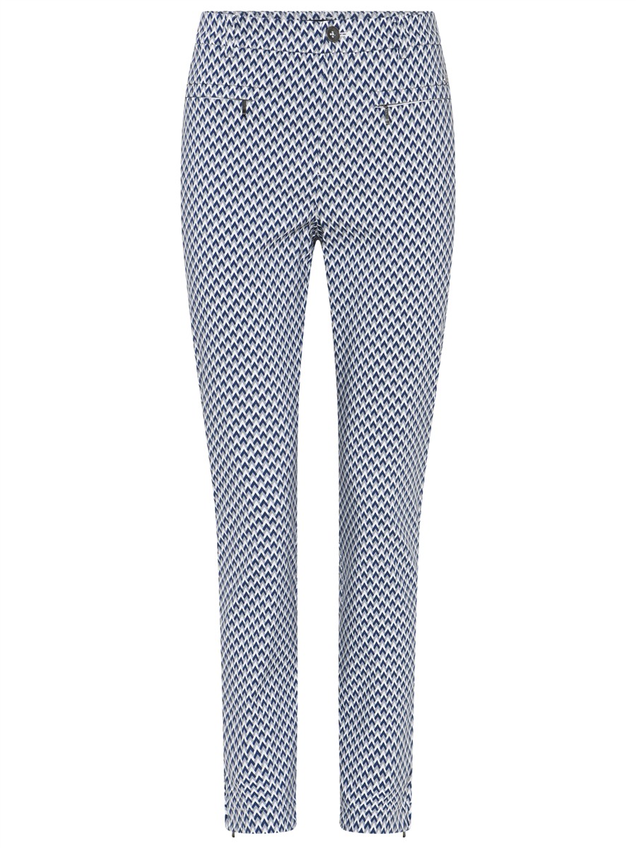 Buksen kombinerer et klassisk snit med et moderne grafisk mønster i smukke farver. Det tætte zigzag-inspirerede print giver buksen et eksklusivt udtryk, der nemt kan styles både til hverdag og mere formelle anledninger.
