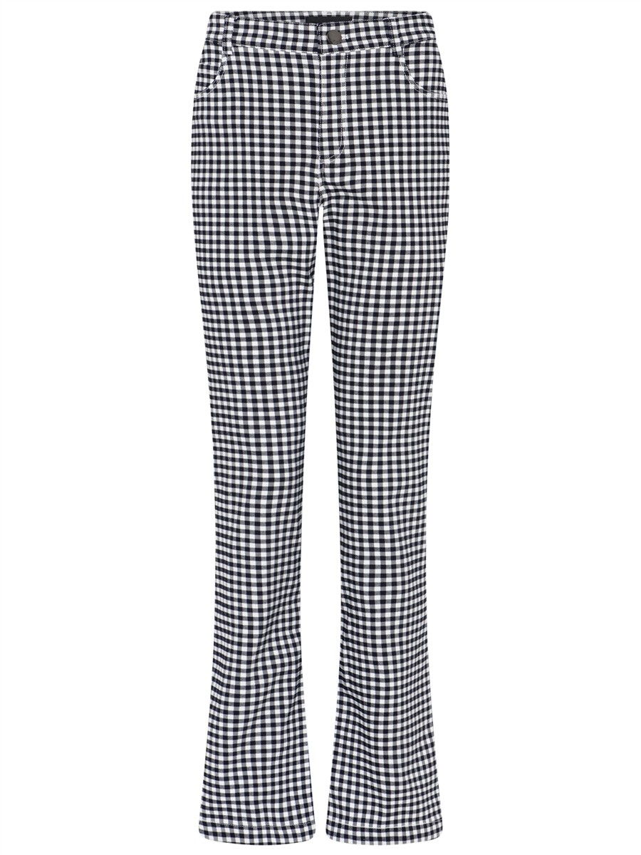 Buksen er med hvide/mørkeblå tern.