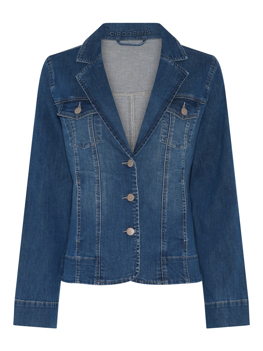 Smart denimjakke fra Cero, som forener klassisk denim med et elegant, blazer-inspireret snit, der giver et moderne udtryk. Jakken er syet i en medium blå denim med lette washed detaljer, som tilfører et afslappet, men stadig stilrent look. Fronten lukkes med fire metalliske knapper, og den klassiske reverskrave understreger det blazer-lignende design.