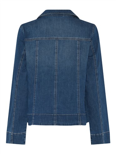 På brystet har den to lommer med klap og knap, mens de lodrette søm- og indsnitsdetaljer på forstykket skaber en mere figursyet silhuet. Ærmerne er lange med manchet. Bagsiden er konstrueret med både horisontale og vertikale sømme, som giver jakken ekstra struktur og et tidløst denimudtryk.
