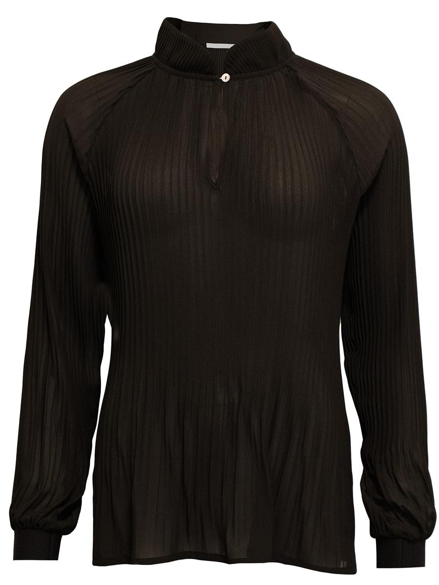 Smart bluse fra Costamani. Blusen har pliseringer og lange ærmer. Ved hådleddet har blusen elastik med sølvtriber. Blusen lukkes med en lille knap i halsudskæringen.