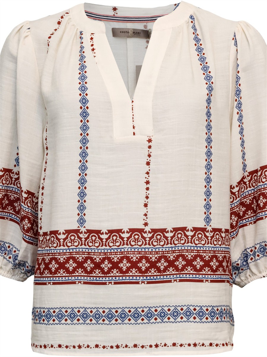 Smuk, let og klædelig bluse fra CostaMani i feminint look. Blusen er med et smukt print i blå og mørkrøde farver og med V-hals samt 3/4 ærmer med elastik.