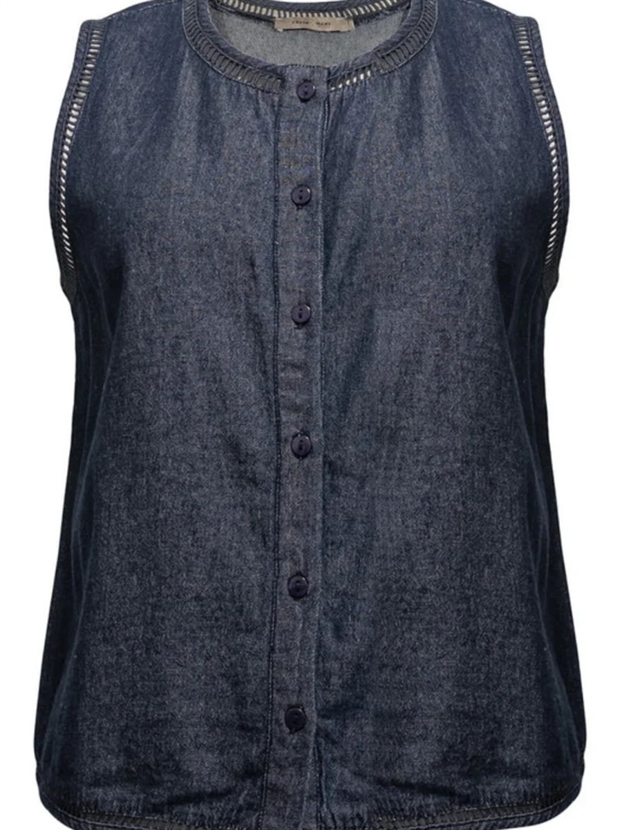 Ærmeløs bluse, som er gennemknappet og har rumd hals. Der er fine stikningsdetaljer langs alle kanter. Brug blusen alene eller over skjorte eller kjole.