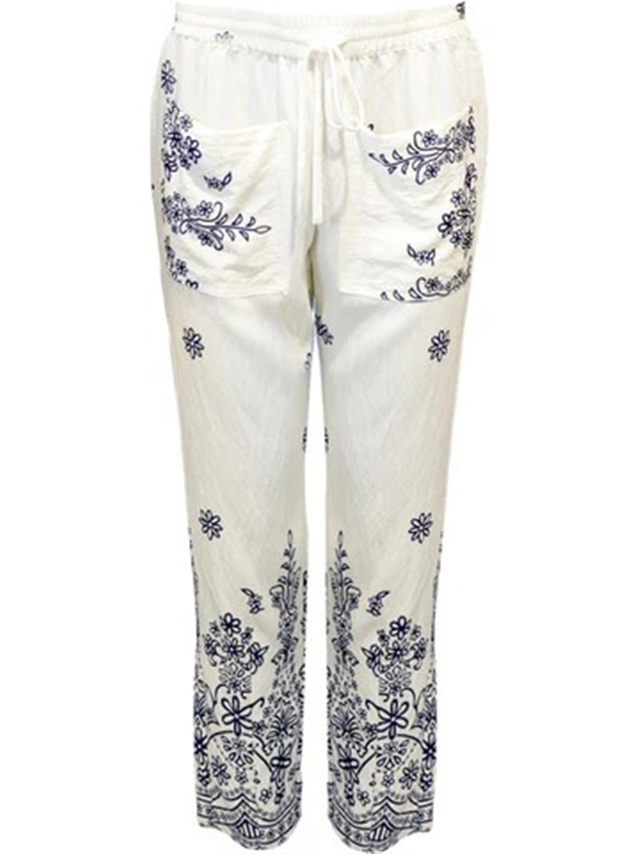 Buks med smukt dekorativt print i blåt. Buksen har elastik i taljen. den har to lommer foran og to baglommer.