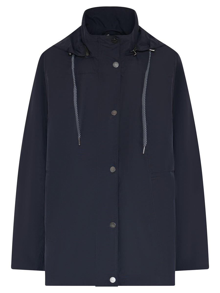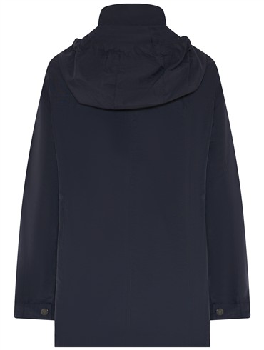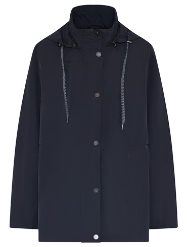 Den kan strammes ind i taljen og har hætte med justerbar snøre.