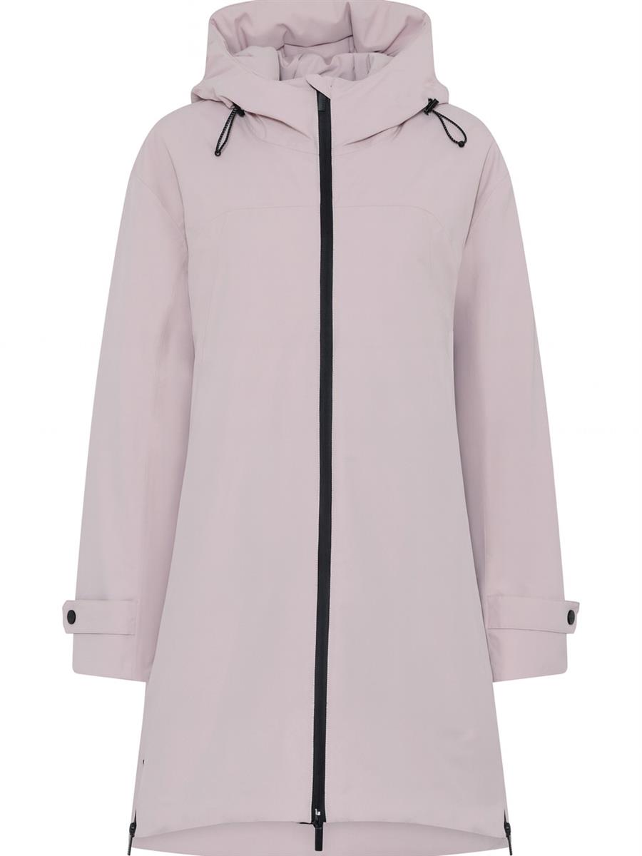 Jakken har hætte med justerbar snøre og kan lynes op i begge sider, så den er let at cykle med.