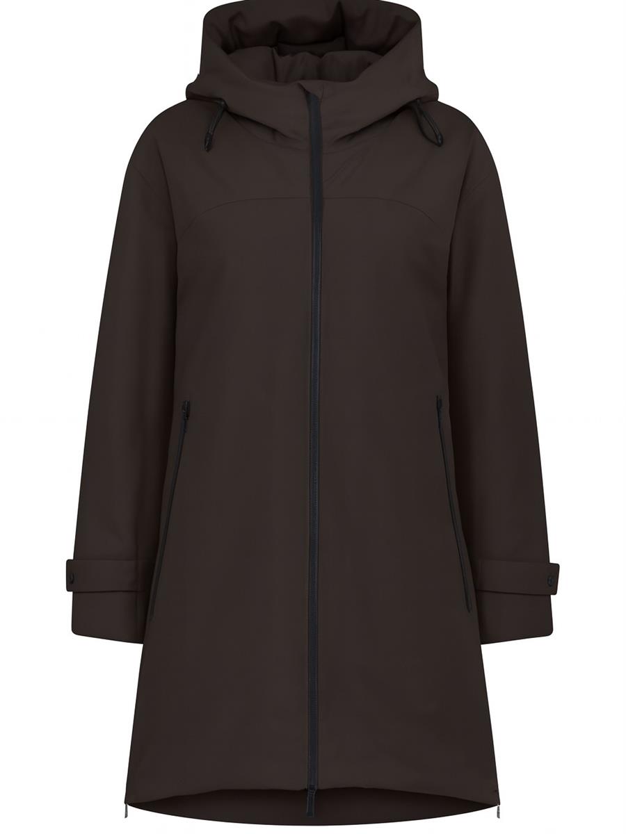 Jakken har hætte med justerbar snøre og kan lynes op i begge sider, så den er let at cykle med.