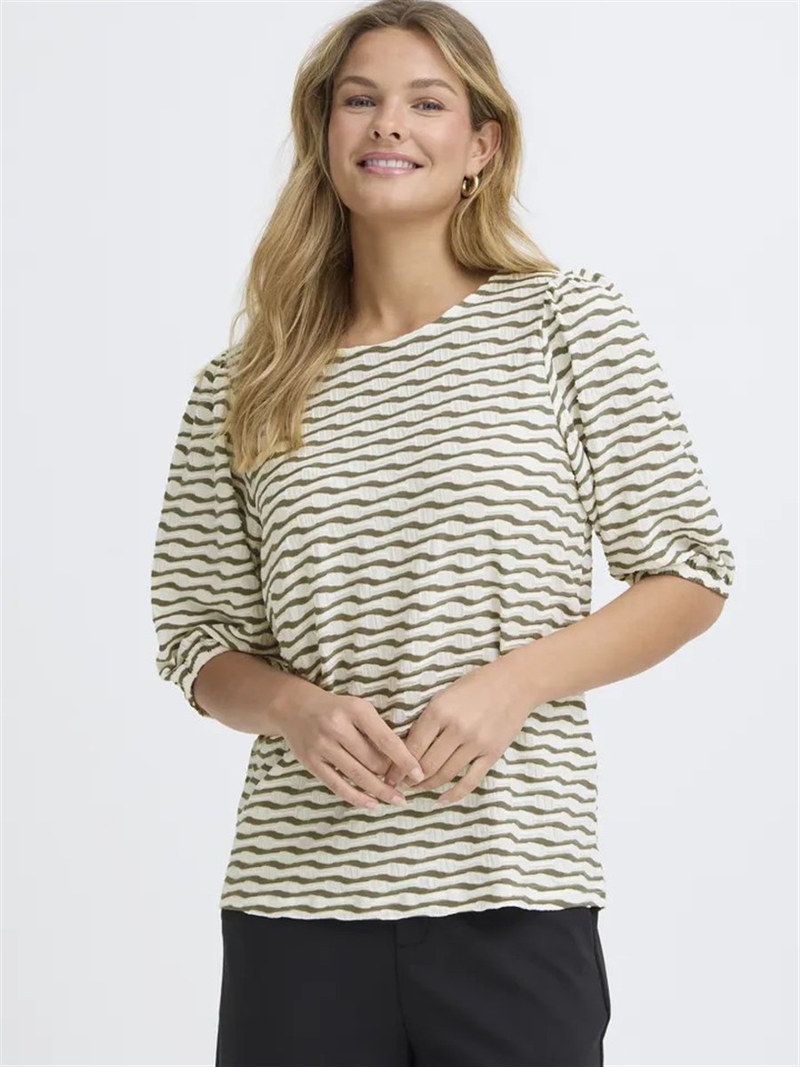 Fransa bluse med rund hals og korte ærmer med elastik og let puf. Hvid med strib. Meget strækbart matriale med flot struktur vævning.