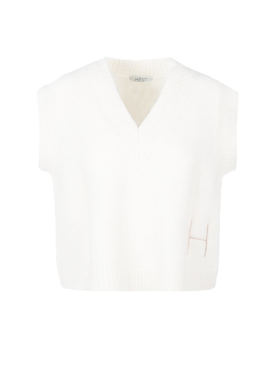 Cool og trendy strikvest fra HÈST i lækker kvalitet. Vesten er talje kort, med V-hals og moderat i bredden.