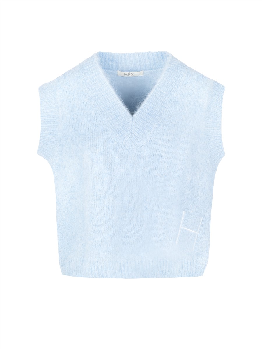 Cool og trendy strikvest fra HÈST i lækker kvalitet. Vesten er talje kort, med V-hals og moderat i bredden.