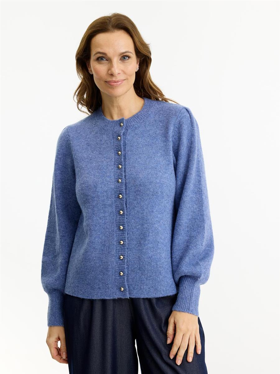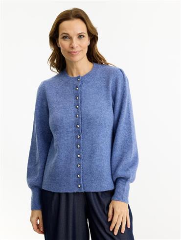 Blå cardigan, med smukke perle knapper og ballon ærmer.