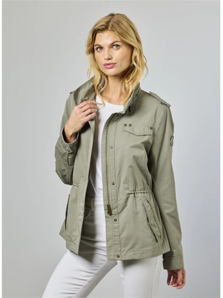 Super cool og trendy jakke fra Junge i smuk lys oliven farve. Jakken er kort og med indvendig snørre i livet, lynlås og knapper foran samt lommer. Jakken er derudover lavet i et cool militær look med nitte detaljer ved lommer og skulder stropper samt med lynlås udvendig i kraven. Jakken har desuden en inderlomme med lynlås.