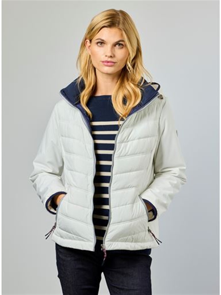 Smart hybrid jakke. Ærmer, hætte, yderkrave og dele af krop i glat polyester. Forstykke og ryg har et quiltet nylonpanel med diagonalsyninger.