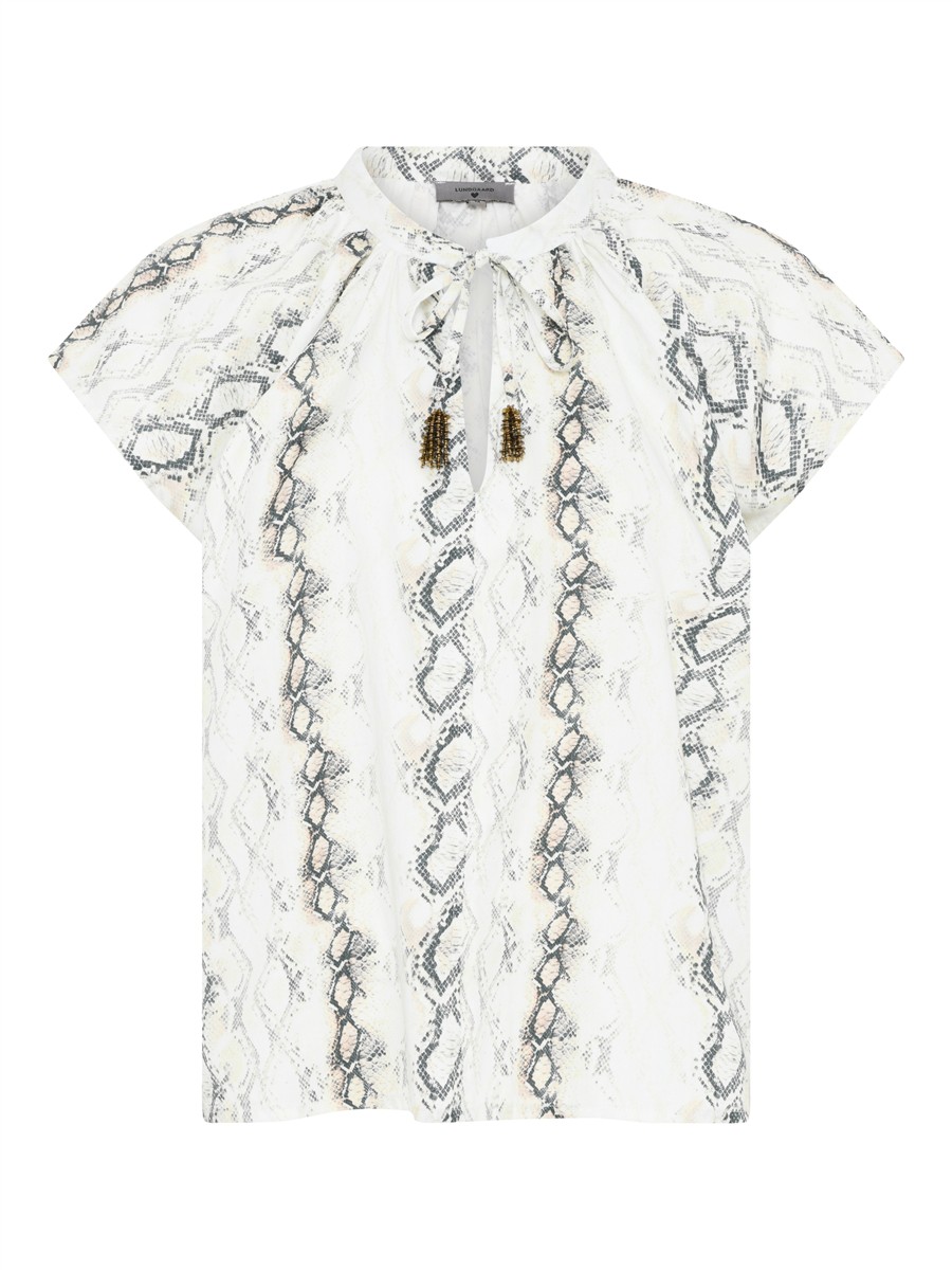 Den designet i et let og luftigt materiale med et markant slangeskindsinspireret print i nuancer af hvid, grå og beige. Den korte ærmelængde og det løse snit giver modellen et behageligt fald, som gør den velegnet til både hverdagsbrug og mere afslappede, pæne anledninger. Halsudskæringen er rund og afsluttes med et lille keyhole foran, bundet med en smal snøre med dekorative kvaster.