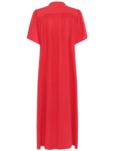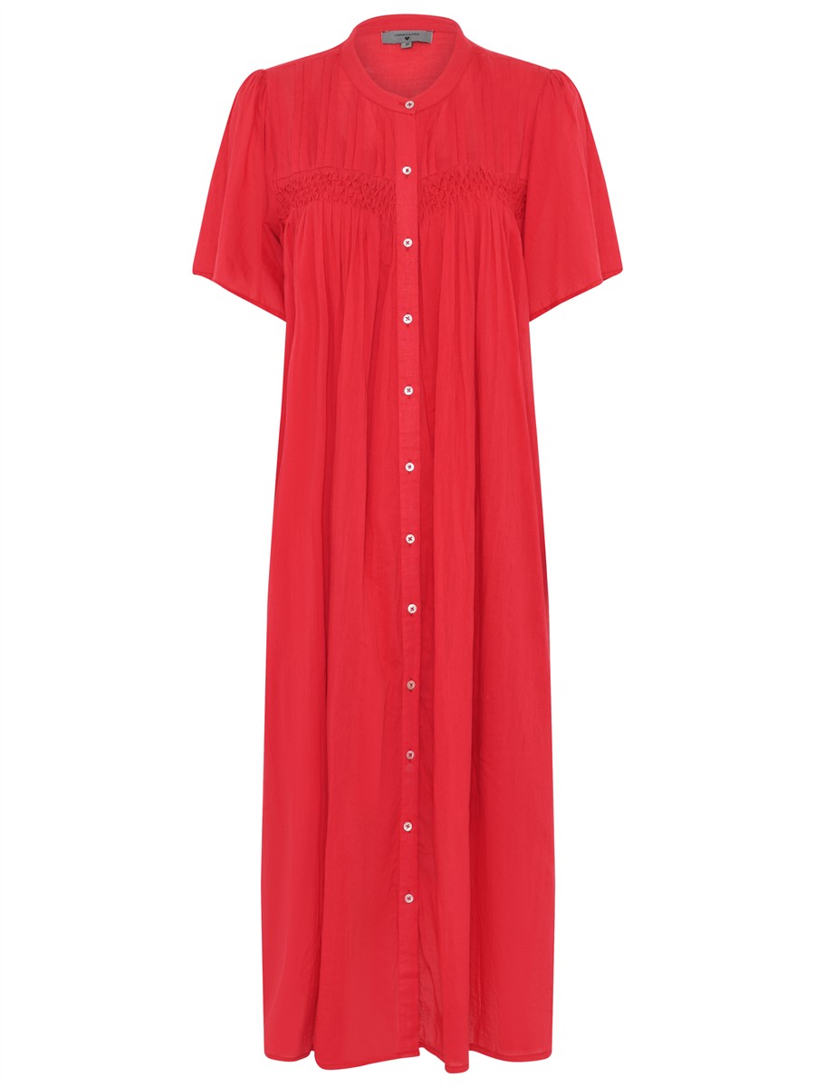 Kjolen har en løs pasform med korte, vide ærmer og en lang silhuet, som gør den behagelig at have på hele dagen. Den fine stolpelukning med knapper hele vejen ned foran giver et klassisk look, mens de dekorative detaljer og smock-inspirerede bånd over brystet tilfører et eksklusivt og romantisk præg.