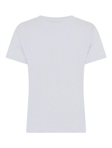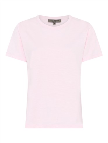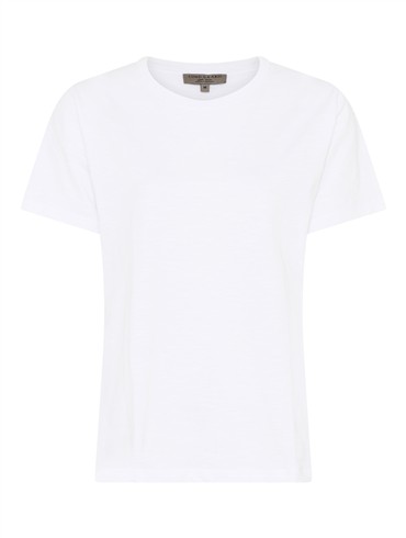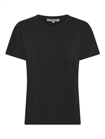 Den bløde kvalitet og det klassiske snit giver en behagelig pasform, som gør den oplagt til både hverdagsbrug og afslappede dage. Designet er minimalistisk med rund hals og korte ærmer, hvilket gør den nem at style med alt fra jeans til nederdele. En alsidig basisstyle, der hurtigt bliver en favorit i garderoben.