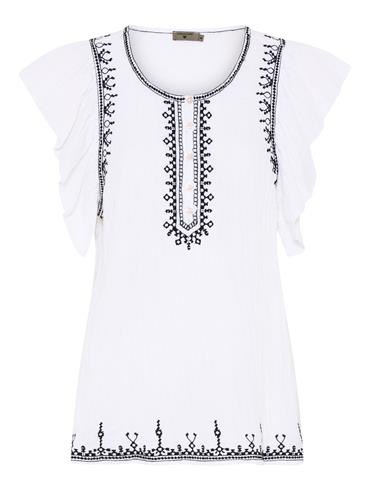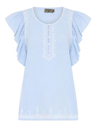 Smuk ærmeløs top fra Lundgaard, designet med fint broderi. Toppen har en rund halsudskæring og en dekorativ knaplukning foran, der tilføjer et klassisk touch. Den har fine broderidetaljer på halsen, knapstolpen, ærmekanterne og den nederste kant, hvilket skaber et harmonisk og stilfuldt udtryk. De let rynkede flæseærmer tilfører et romantisk og moderne twist, perfekt til både hverdag og semi-formelle lejligheder.