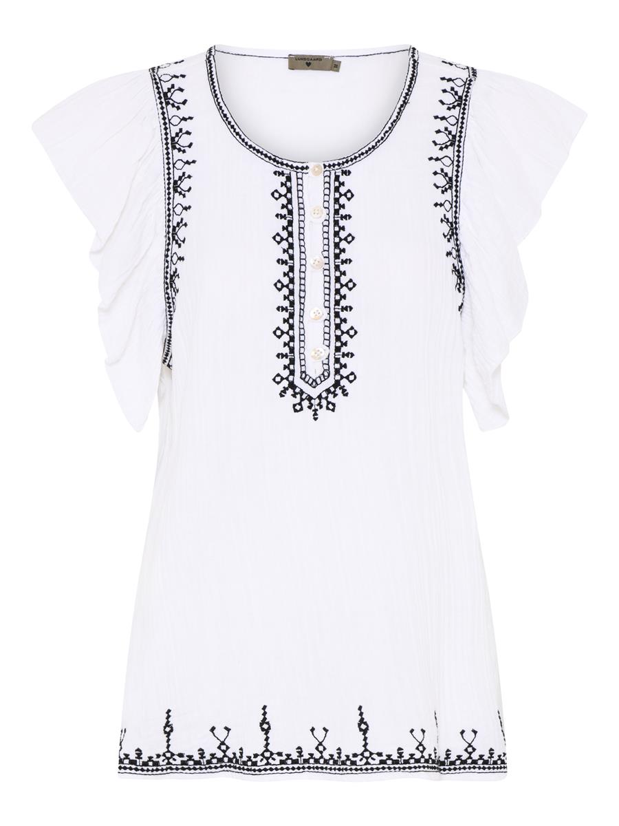 Smuk ærmeløs top fra Lundgaard, designet med fint broderi. Toppen har en rund halsudskæring og en dekorativ knaplukning foran, der tilføjer et klassisk touch. Den har fine broderidetaljer på halsen, knapstolpen, ærmekanterne og den nederste kant, hvilket skaber et harmonisk og stilfuldt udtryk. De let rynkede flæseærmer tilfører et romantisk og moderne twist, perfekt til både hverdag og semi-formelle lejligheder.