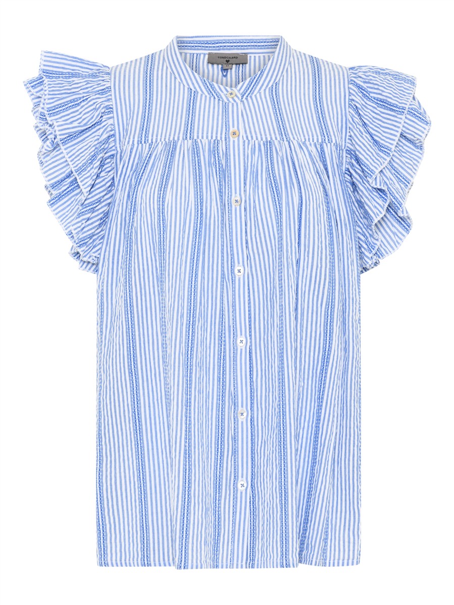 De blå og hvide striber giver et klassisk og rent udtryk, mens de korte flæseærmer tilfører et blødt, elegant touch. Toppen har rund hals og gennemgående knapper, som gør den nem at style både åben og lukket. Pasformen er løs og behagelig, hvilket giver et afslappet, men stadig velklædt look, perfekt til både hverdag og mere pæne anledninger.