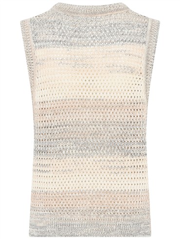 Vesten er designet i et smukt, luftigt hulmønster med bløde, horisontale striber i dæmpede nuancer som beige, creme og grå. Det giver et naturligt, harmonisk farvespil, der gør den nem at kombinere med både basisdele og sæsonens favoritter.