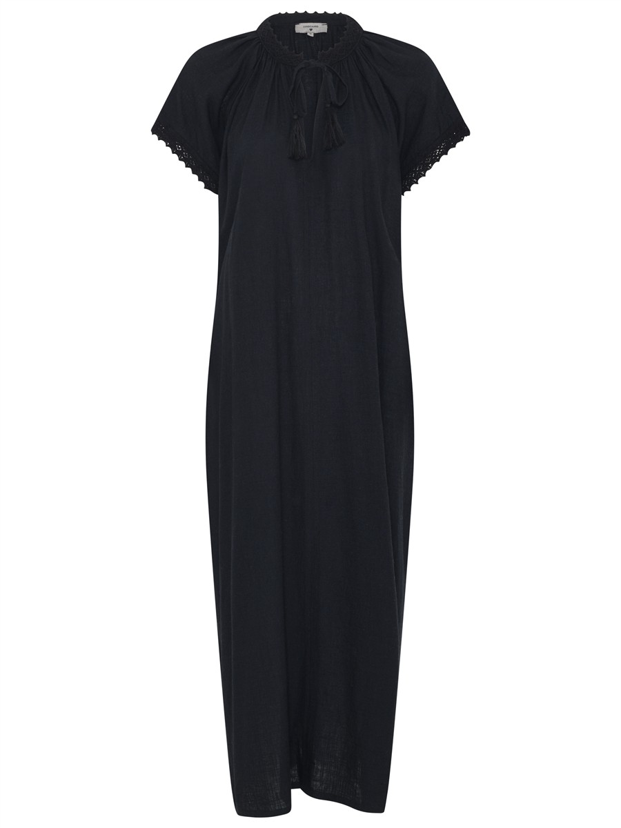 Designet er enkelt og feminint med en løs, lige pasform, der falder flot ned langs kroppen og giver et luftigt udtryk. Den runde halsudskæring er smukt dekoreret med fine læg og bindebånd med kvaster, som tilføjer et boheme-inspireret touch. De korte ærmer har en diskret bølget kant med fine detaljer, der fuldender det elegante look.