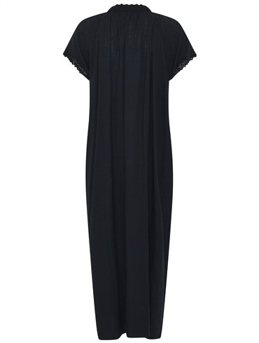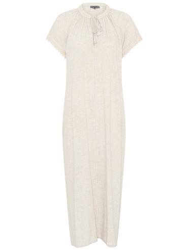 Denne smukke hørkjole fra Lundgaard er indbegrebet af afslappet elegance og komfort til de varme måneder. Kjolen er fremstillet i let og åndbart hør, som føles behageligt mod huden og gør den ideel til både hverdag og ferie.