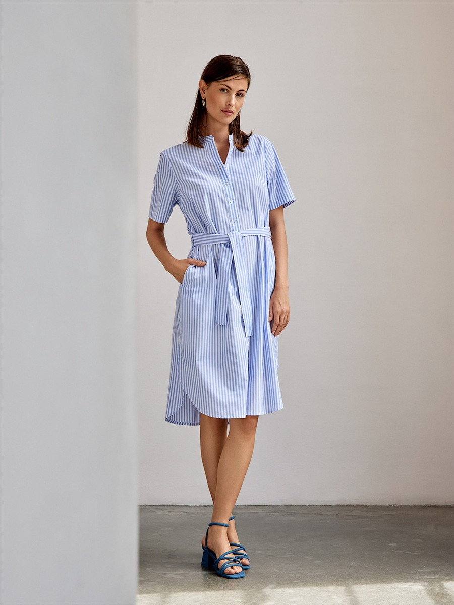 Florlet skjortekjole med blå striber og bindebånd