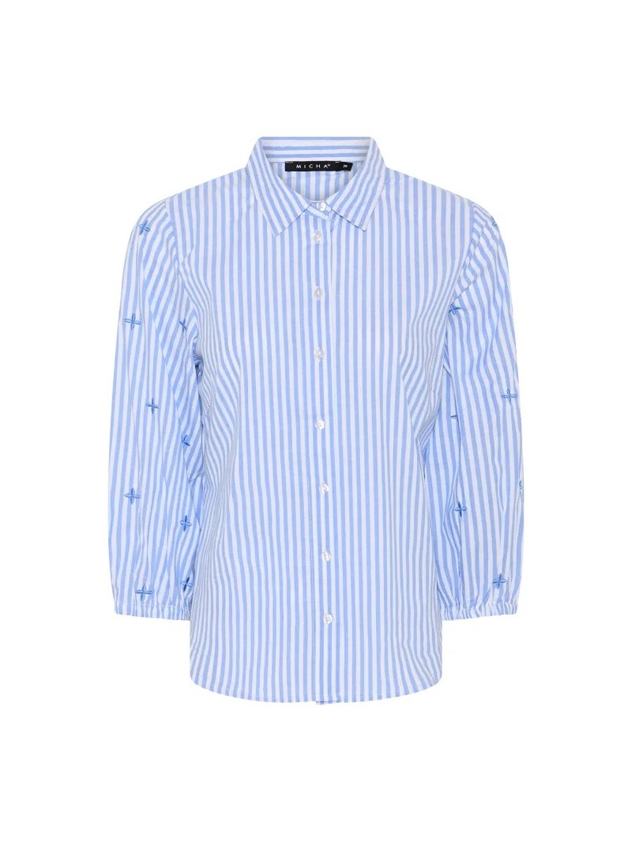 Smart skjorte designet med striber og broderinger på ærme. Skjorten er gennemknappet og har elastik ved håndled.