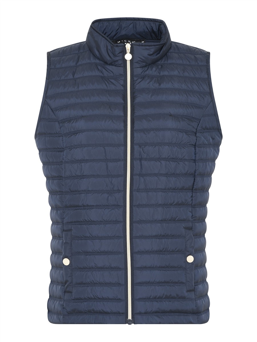 Marineblå tynd vatteret vest med lynkås og lommer, perfekt under et stykke overtøj på de kolde dage.