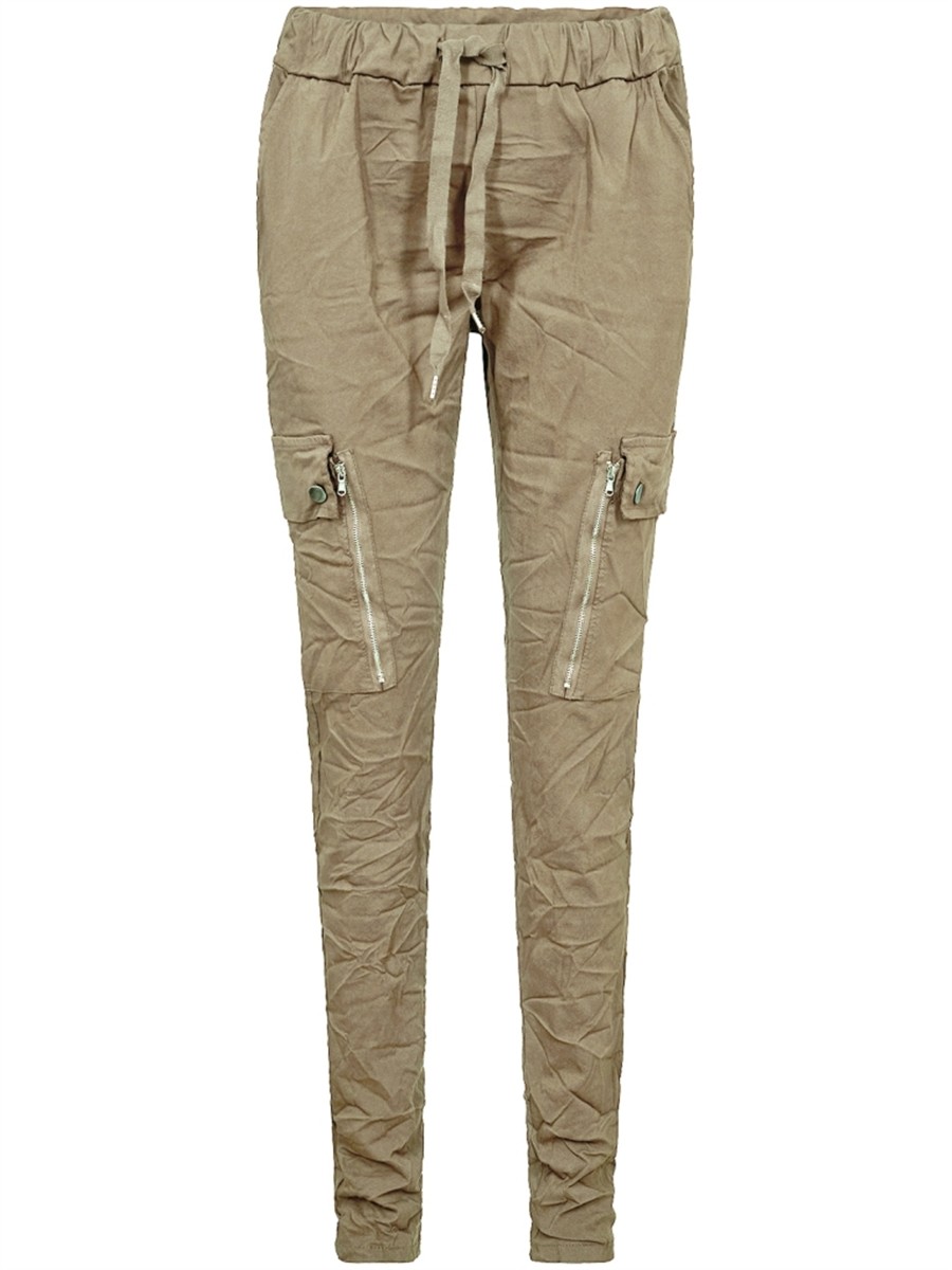 Disse cool bukser er i en lækker bomuldskvalitet med masser af stretch. Bukserne har en let baggy pasform og en elastisk talje med bindebånd, der sørger for en fantastisk komfort. Midt på bukserne er der to store lommer med knapper samt en lang pyntelynlås, som giver en rå detalje.