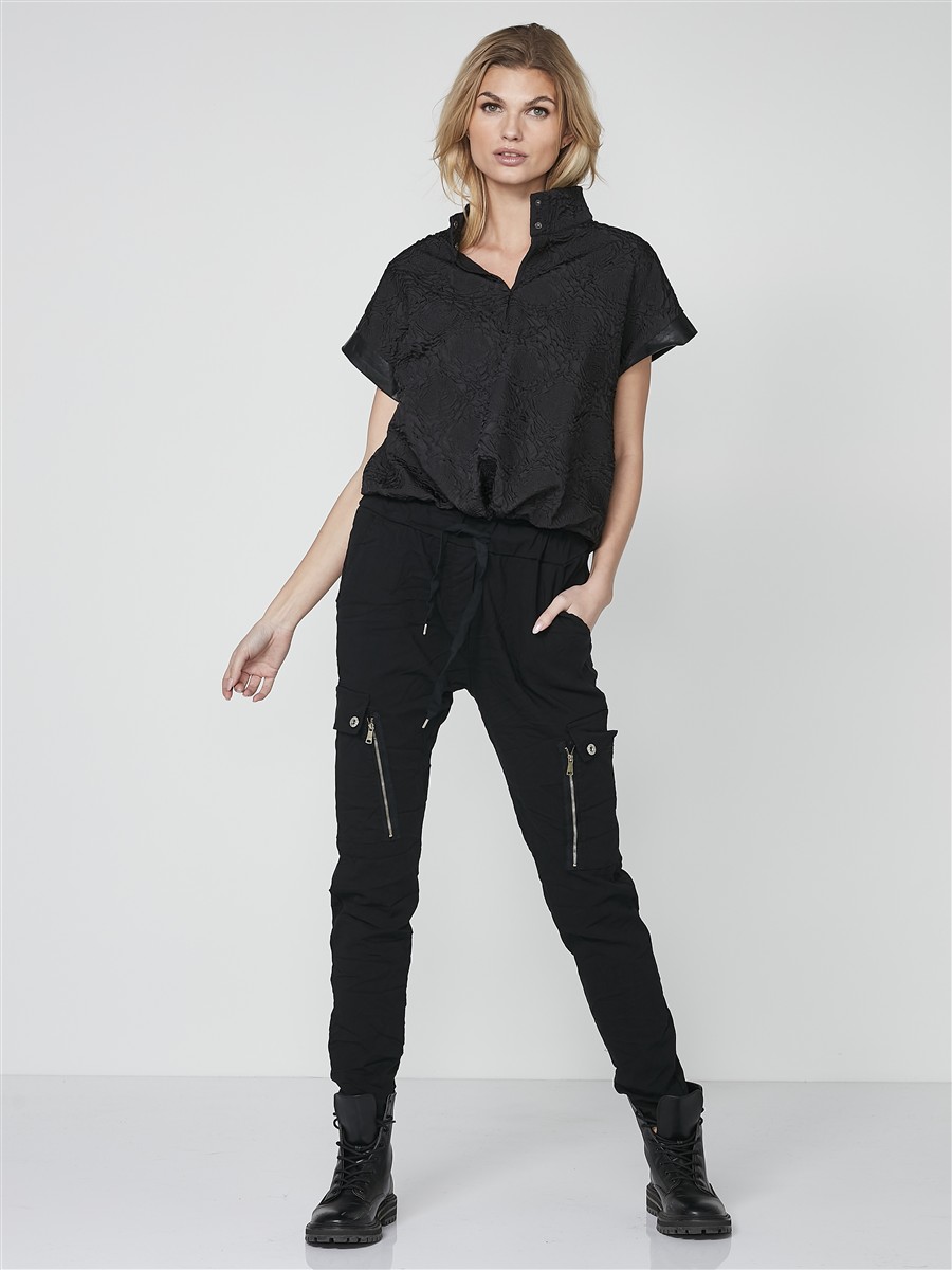 Disse cool bukser er i en lækker bomuldskvalitet med masser af stretch. Bukserne har en let baggy pasform og en elastisk talje med bindebånd, der sørger for en fantastisk komfort. Midt på bukserne er der to store lommer med knapper samt en lang pyntelynlås, som giver en rå detalje.