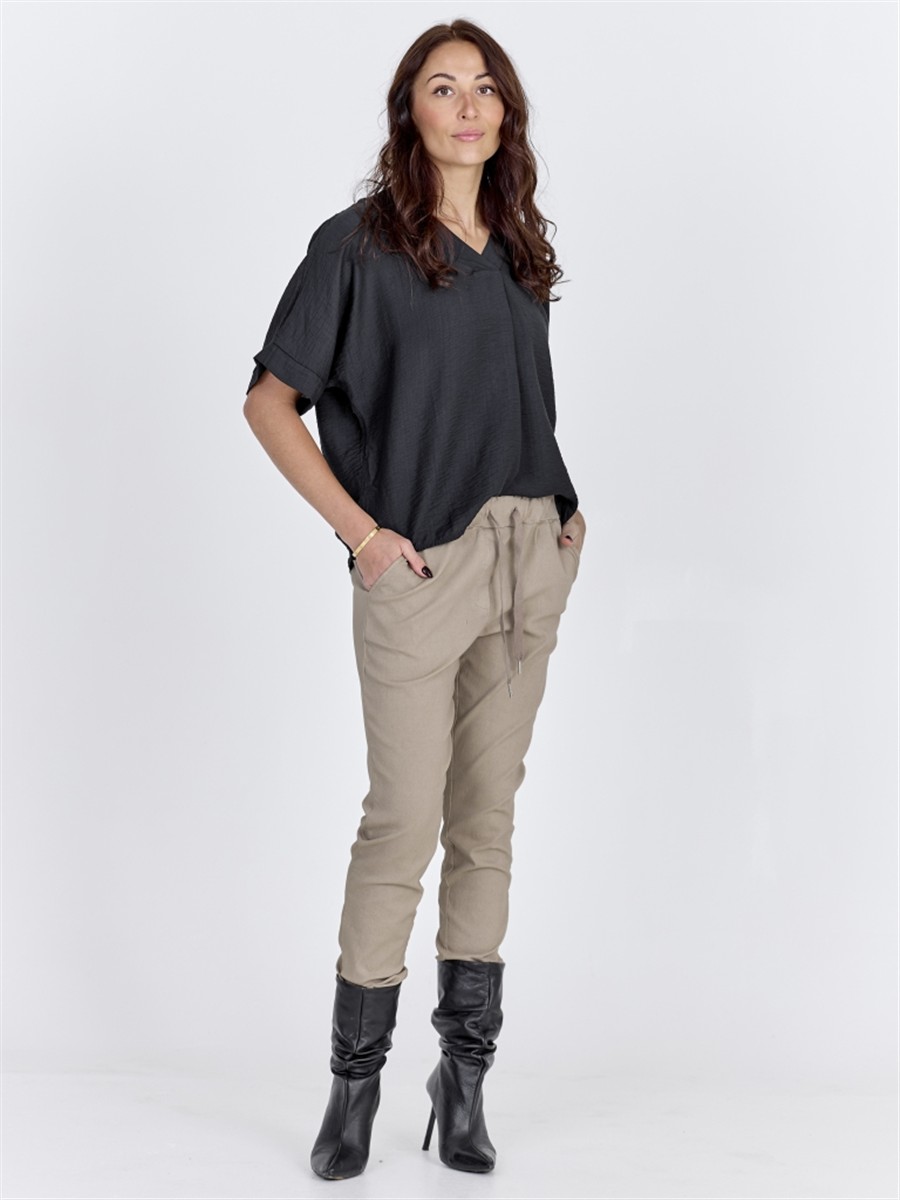 Cool og piv lækker buks fra Nü med masser af stræk i. Buksen er blød og behagelig, med snøre i livet og skrålommer. Har lidt fylde for oven og stram i snittet i benene. Meget flexibel buks, der er til den store side i størrelsen.