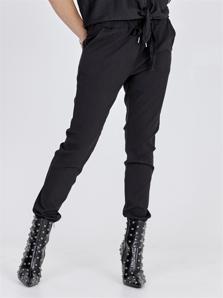 Cool og piv lækker buks fra Nü med masser af stræk i. Buksen er blød og behagelig, med snøre i livet og skrålommer. Har lidt fylde for oven og stram i snittet i benene. Meget flexibel buks, der er til den store side i størrelsen.