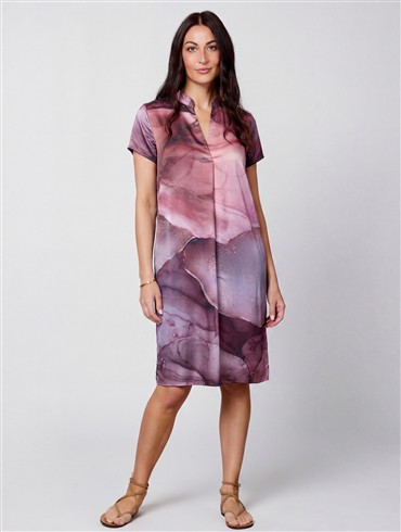 Kjole med løs og lige pasform. Den har korte ærmer og v-hals med en lille krave.