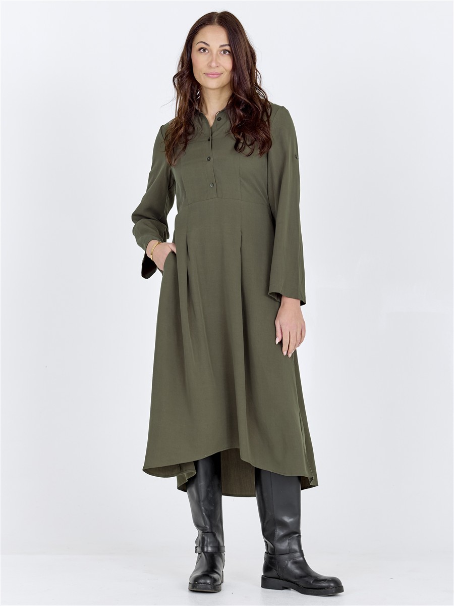 Denne kjole har et enkelt og tidløst udtryk med sin skjortekrave, knaplukning og rene linjer. Foran har den fine læg, som giver et let fald i skørtet, mens elastikken bagpå sikrer en behagelig og formfulgt pasform.