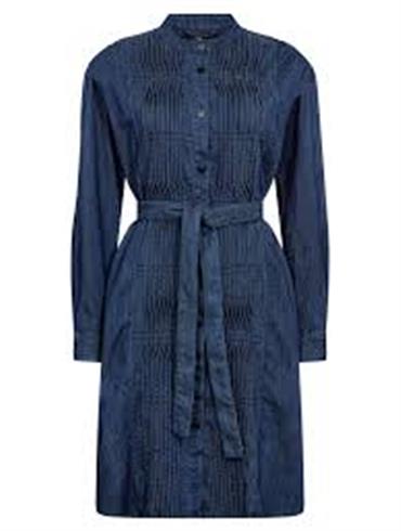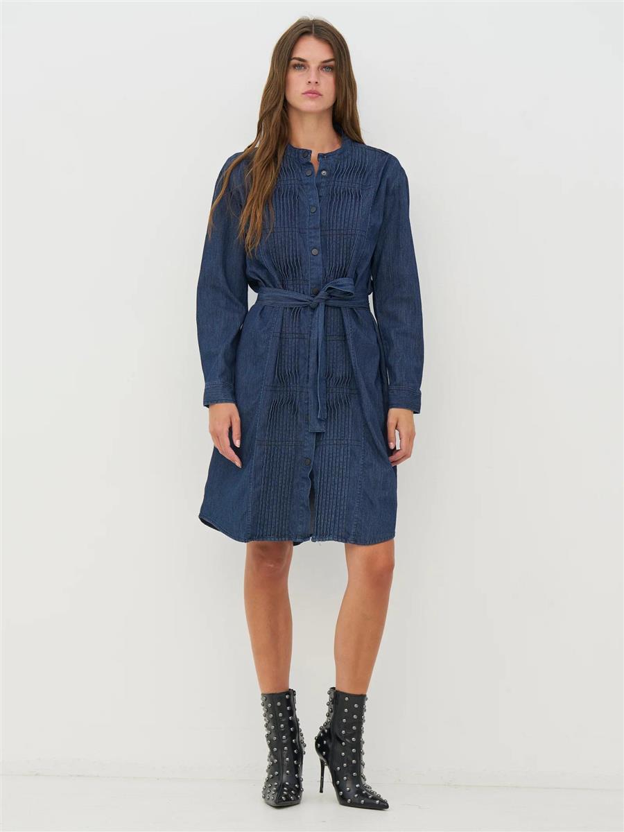 Denne kjole i denim har et feminint og velafbalanceret udtryk med lange ærmer og gennemgående knaplukning fortil. De fine læg på fronten giver struktur, mens bindebæltet i taljen fremhæver pasformen på en naturlig måde. Bagsiden er enkel og falder pænt langs kroppen.