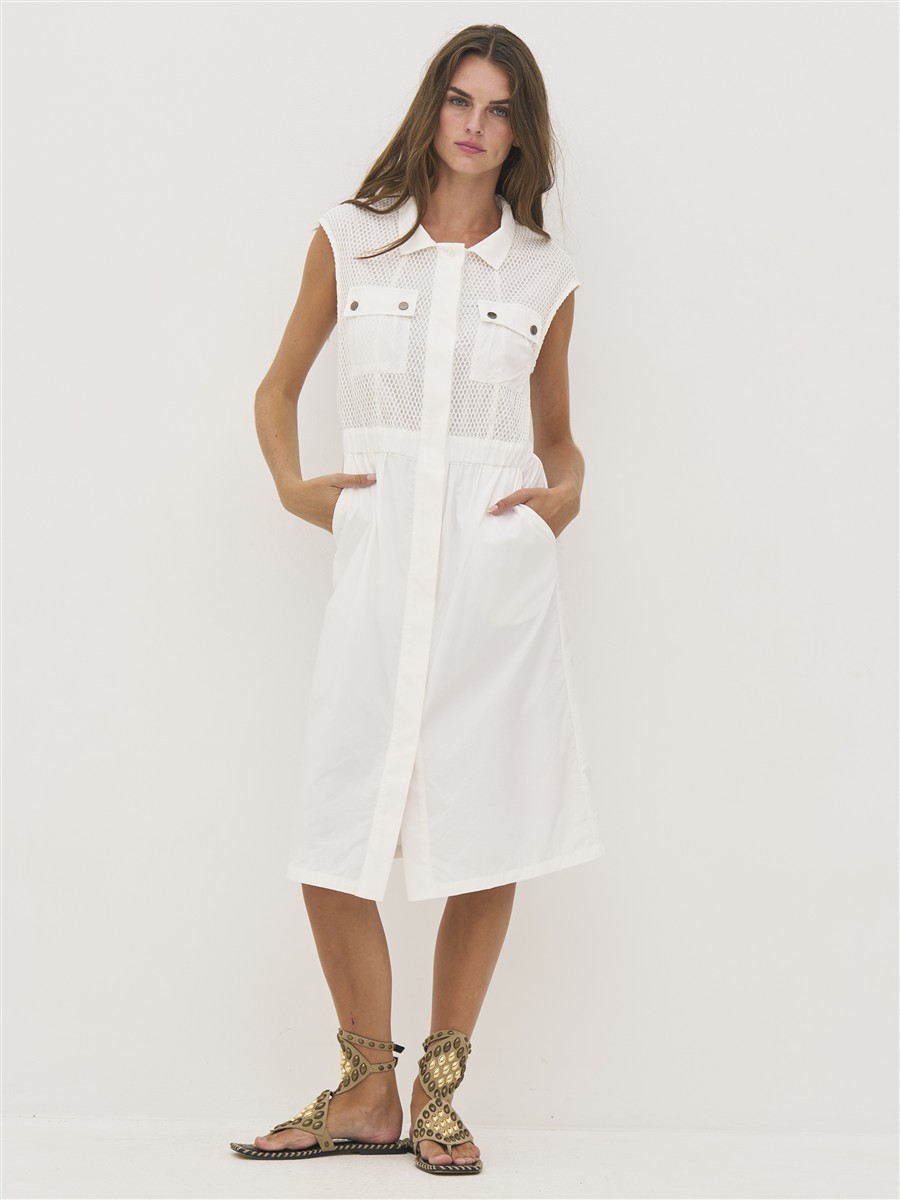Kjolen har en strikket overdel med for, den har brystlommer med trykknapper og har elastik i taljen.