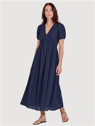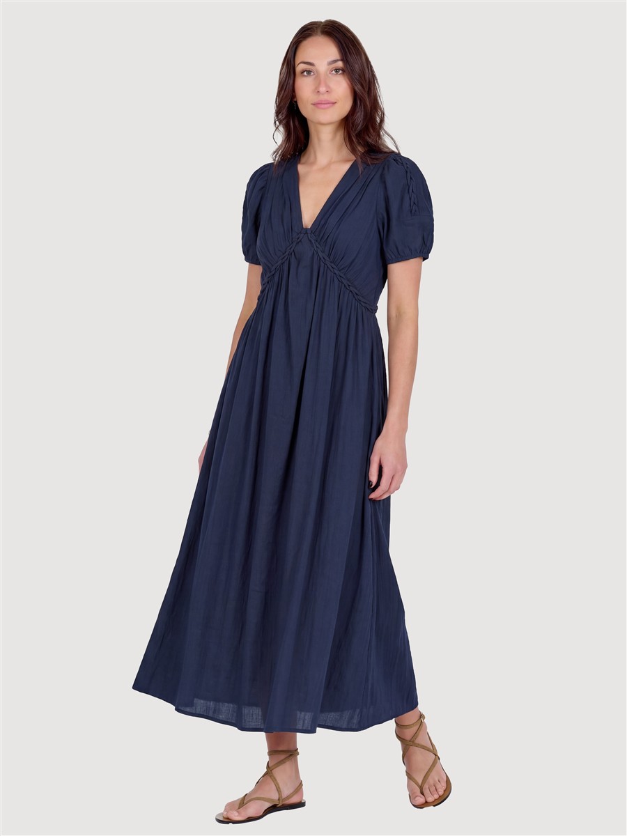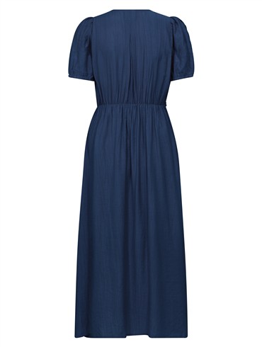 Denne kjole er fremstillet i en let viskoseblanding med crepe. Den har en V-udskæring med flettet detalje foran. Korte pufærmer og elastik bagpå ved taljen.