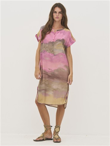 Tunika kjole fremstillet i 100% viskose. Den har en afslappet pasform med korte ærmer og slidser i siderne. Den halve knaplukning foran tilfører et enkelt og casual udtryk, der gør kjolen nem at style.