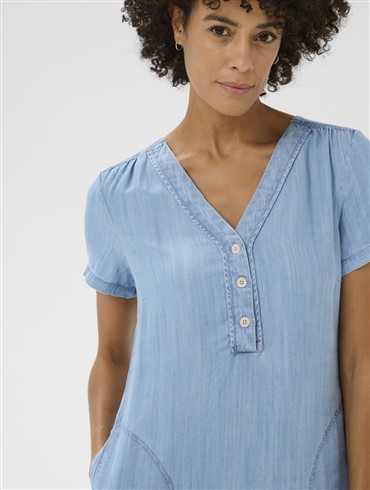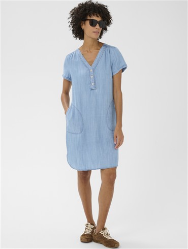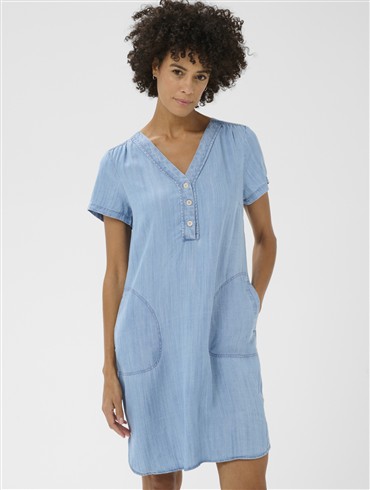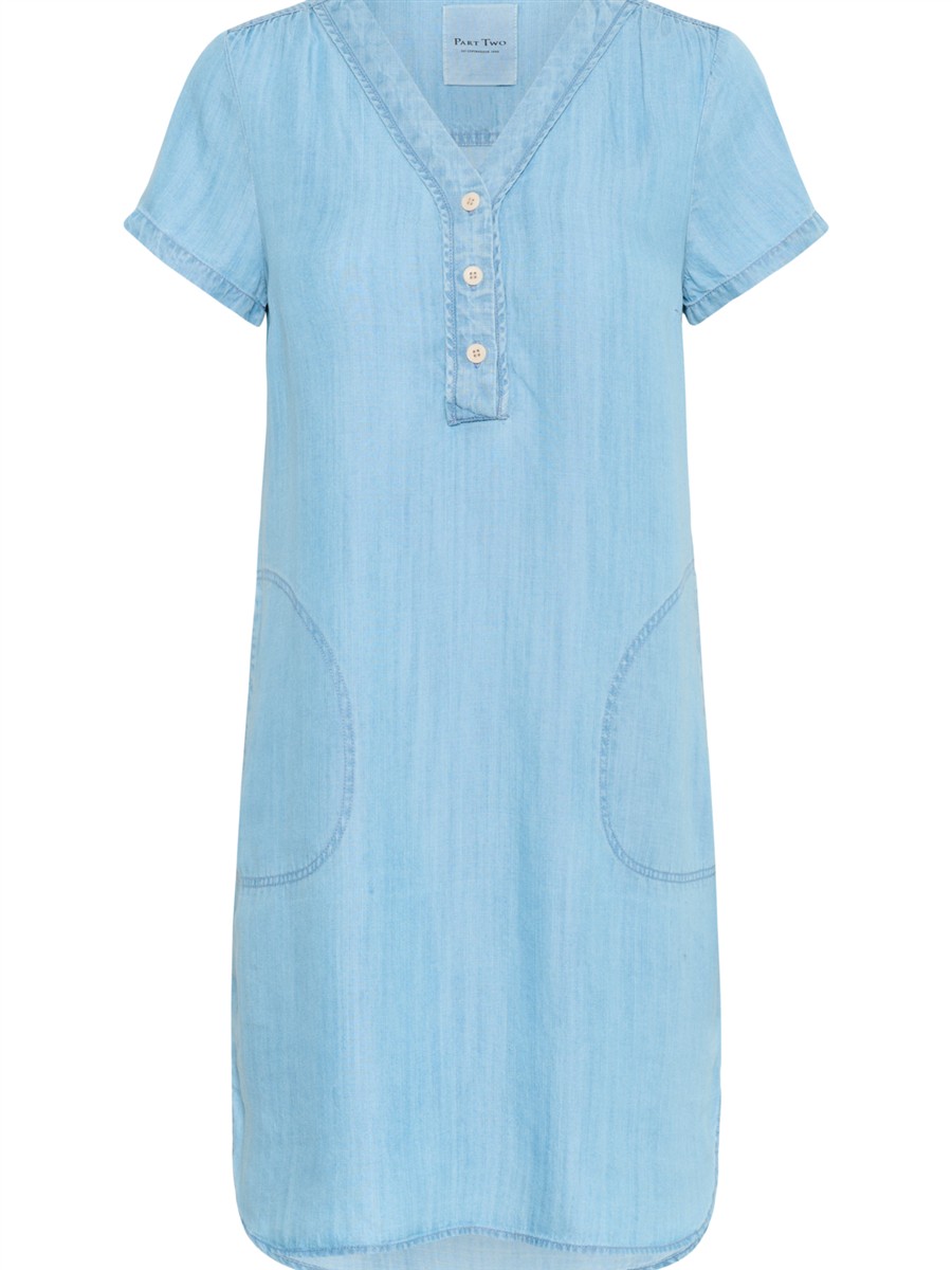 Part Two denimkjole med lige silhuet, korte ærmer, V-hals med knaplukning og store buede sidelommer.