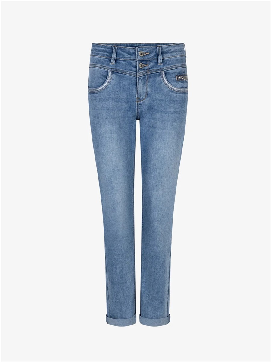 Cool og trendy jeans i smal model og lækker blød kvalitet. Buksen har lille lynlås detalje fortil, dobbelt knapper i linning, samt broderi detalje på forlommerne.