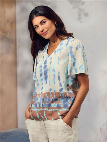 Blusen er beige/sandfarvet med brun i bunden og et smukt akvarellignende blåligt mønster.