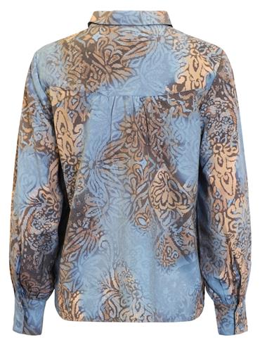 Skjorten har lange ærmer, klassisk krave, gennemgående stolpelukning med små lyseblå knapper.
