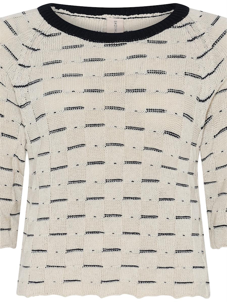 Denne smukke Skovhuus strik er med en klassisk rund halsudskæring, og med 3/4 ærmer, som er to lækre og klassiske detaljer, derudover har den en smart rib kant omkring halsudskæringen, samt en lækker bølget kant i bunden af ærmerne og i bunden af selve strikken.