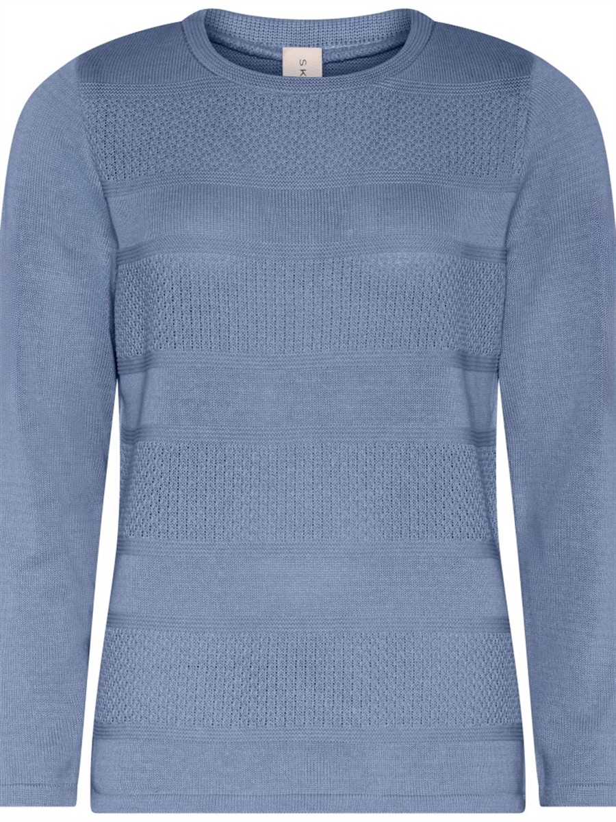 Skøn strik fra Skovhuus med fin struktur. Strikken har lange ærmer og rund hals. Kan bruges med en skjorte under eller over skuldrene en sommeraften.
