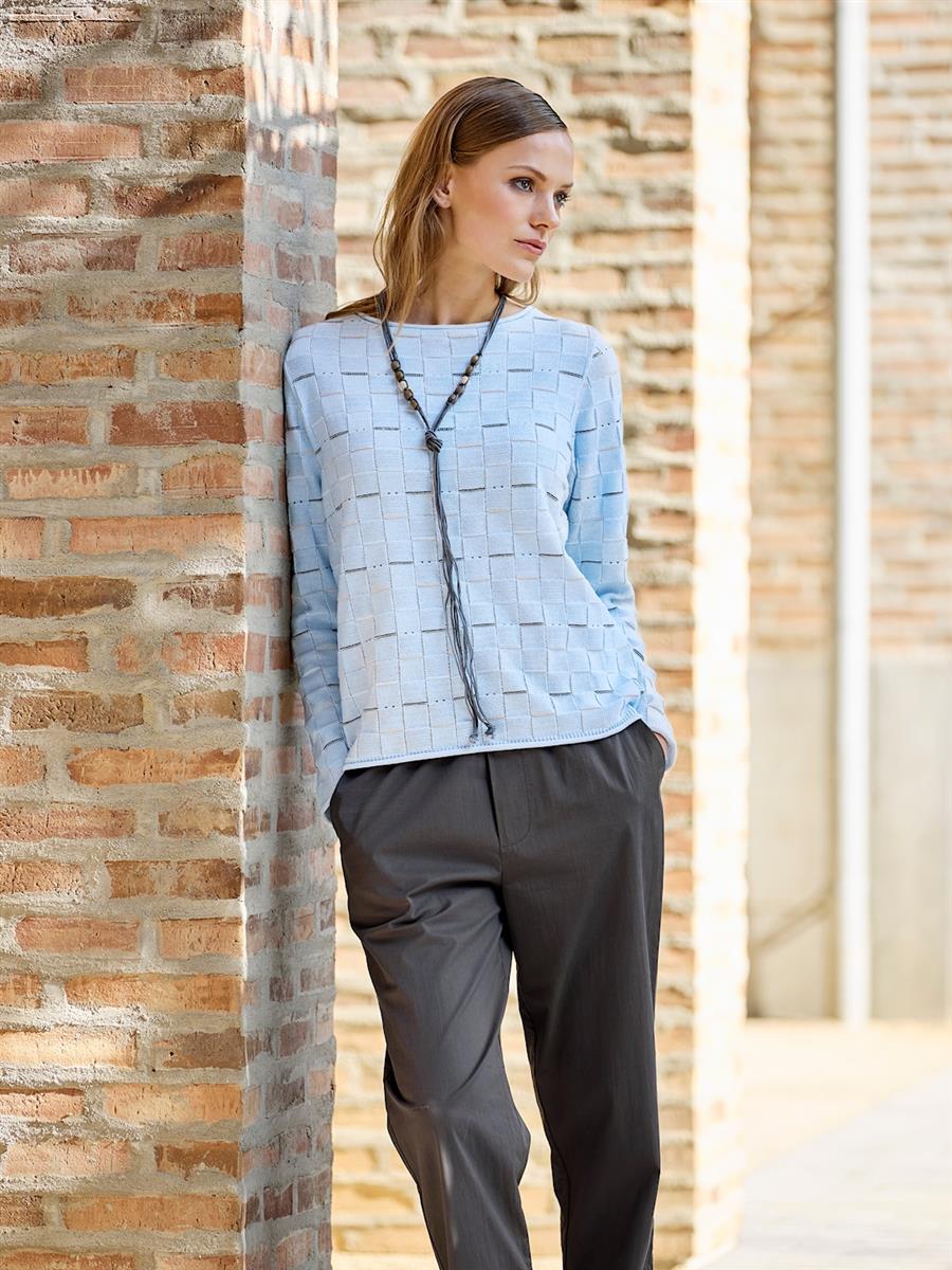 Skovhuus strik i et flot firkantet mønster i smuk lyseblå farve.Trøjen er med rund hals, lange ærmer samt i perfekt pasform. Strikken er lavet i en dejlig blød kvalitet i en bomuldsblanding, som er særdeles behagelig at have på.