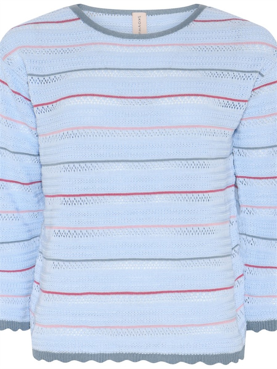 Super fin strik fra Skovhuus med mange skønne detaljer. Strikken har et flot hulmønster og meget dekorativt udtryk. Den har lange ærmer og rund hals.